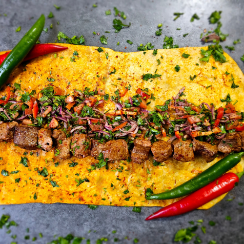 1x Rindfleischspieß mit frischem Gemüse und auf Wunsch mit Soße im orientalischen Brot (Wrap).